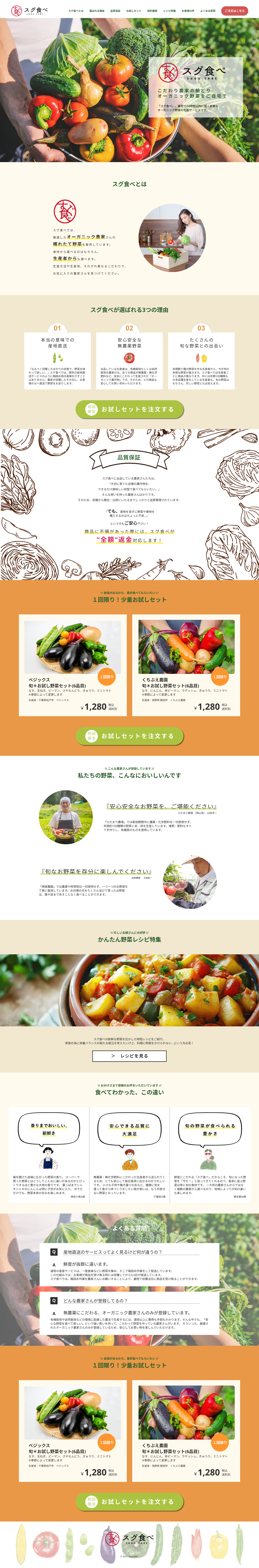 - 野菜の温かみのある配色で統一しつつ、LPらしいビジュアルや情報設計を心がけた。複数のセクションに適度にお試しセットのボタンを配置し、コンバージョン率の向上を意識した。